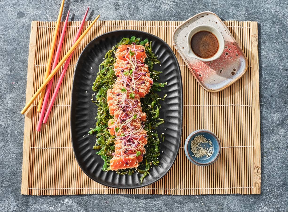 Snijd de zalm met een scherp mes in plakken van 0.5 cm. Verdeel de zeewiersalade over een bord en leg de sushizalm dakpansgewijs erop. Verdeel de kiemgroenten erover en bestrooi met de rest van het sesamzaad. Serveer de rest van de marinade in een kommetje erbij.