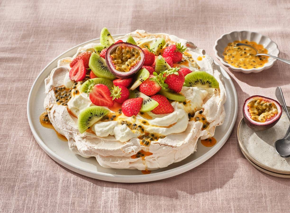 Wil jij ook een keer een klassieke pavlova op tafel zetten? Met een luchtige doch chewy meringue, slagroom en kleurrijke topping van vers fruit zoals aardbeien, kiwi en passievrucht valt deze vast in de smaak!