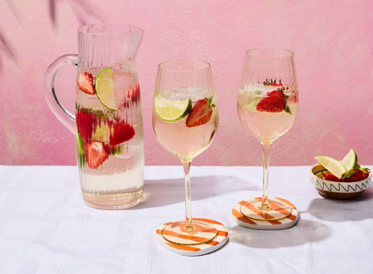 Zei iemand spritz? Ga voor deze bianco spritz met vermout, prosecco en aardbeien. Fris, zoet én kruidig. Hallo, nieuwe zomerfavoriet!
