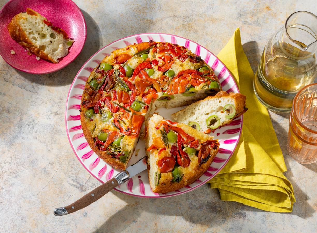 Ondersteboven van focaccia? Deze upside-down variant met zongedroogde tomaten, paprika en olijven is een feestje uit de oven. Buon appetito!