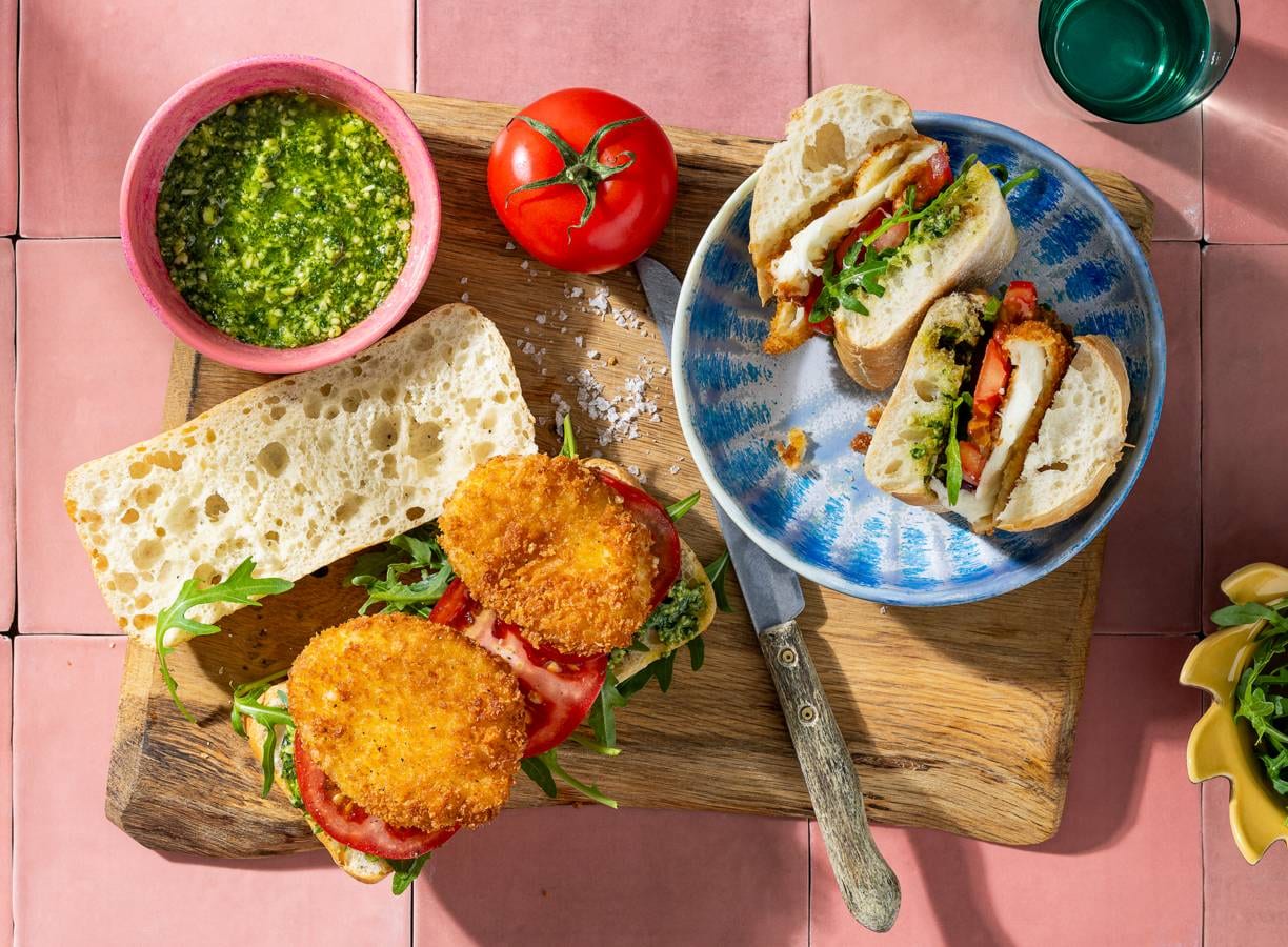 Zin in een next-level caprese? Deze sandwich met krokant gepaneerde mozzarella, pesto en tomaat geeft een verrassende twist aan de Italiaanse klassieker.