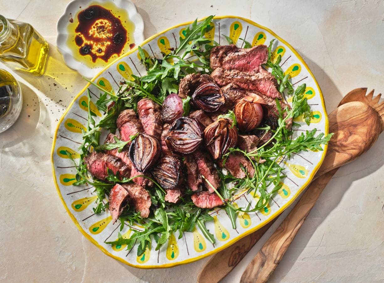 Flat iron steak, balsamico-ui en rucola: een bijgerecht dat je smaakpapillen wakker schudt. In 15 minuten voorbereid, daarna doet de oven de rest.