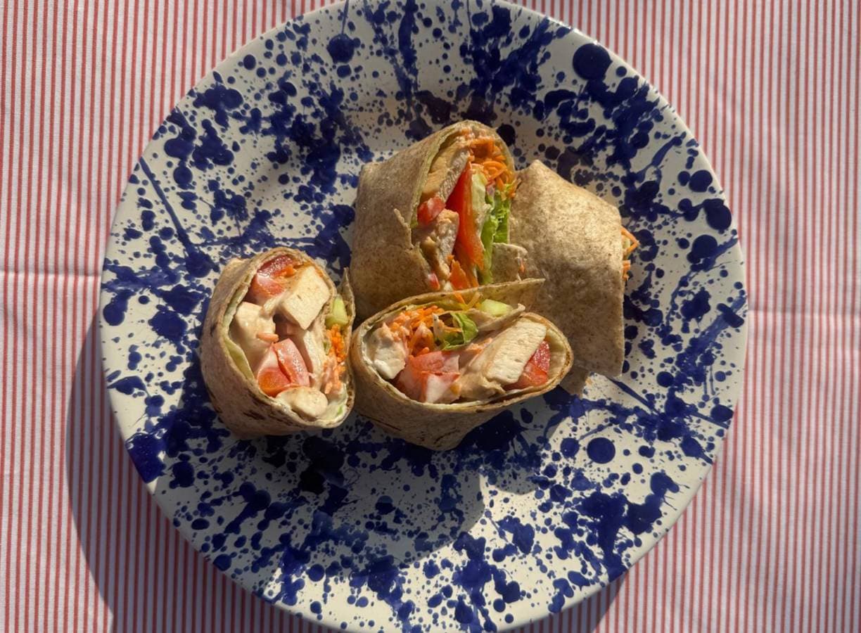 Verwarm de tortilla’s volgens de aanwijzingen op de verpakking en vul met een blaadje sla, kip, 1 el yoghurt en peen. Vouw op tot een burrito. Serveer met de rest van de yoghurtsaus.
