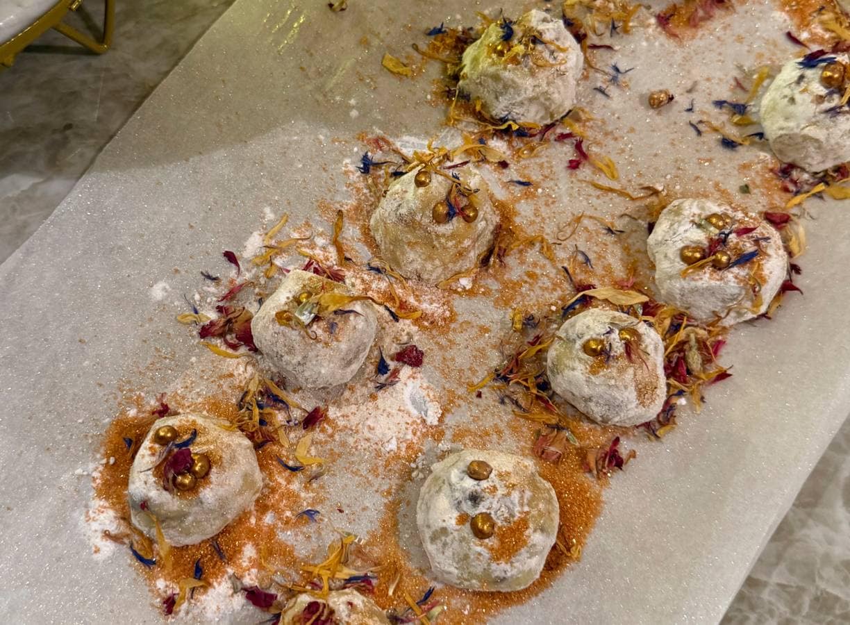 3. Vorm 12 kleine (kerst)balletjes van het chocolademengsel, rol door de poedersuiker en leg op bakpapier. Bestrooi met de grove suiker, parels, goudspray, strooimix en eetbare bloemen.