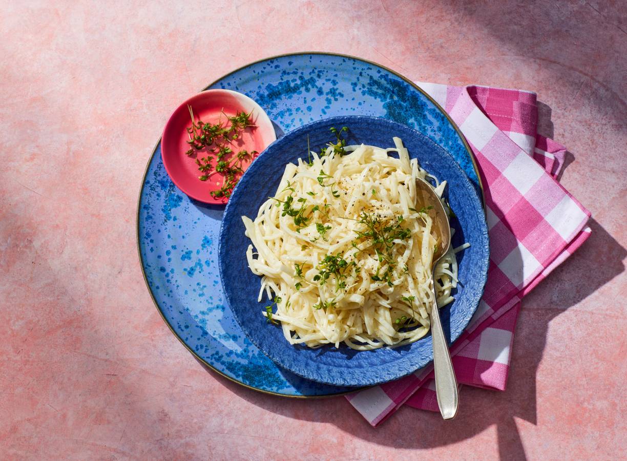 Schil de knolselderij, snijd in plakken van 3 mm en de plakken vervolgens in luciferdunne reepjes (julienne). Kook de reepjes in 1½ min. beetgaar. Giet af en spoel onder koud water. Dit zorgt ervoor dat de reepjes niet doorkoken en lekker knapperig blijven. Laat goed uitlekken.