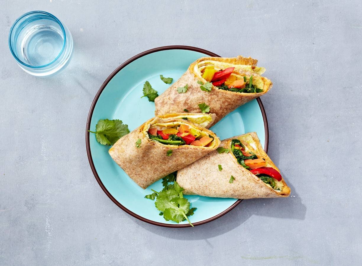 Besmeer de tortilla’s met de hummus en verdeel de omeletten erover. Verdeel de gegrilde groenten en spinazie erover. Vouw de zijkanten van de wraps naar binnen, rol vervolgens strak op en snijd schuin door. Verdeel de rest van de koriander erover.