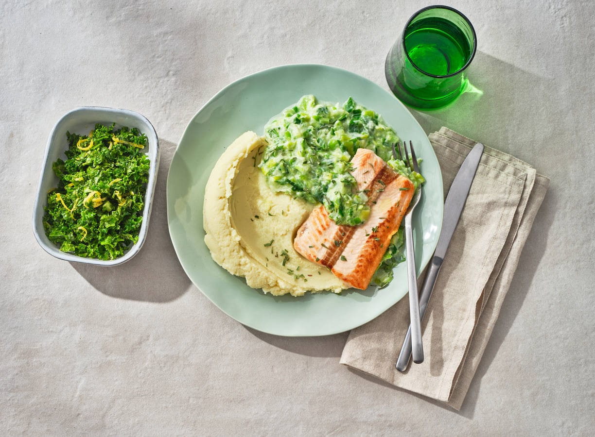 Zachte rosé gebakken zalm, daar schuiven we graag voor aan! Helemaal met deze lekker zachte puree en prei à la crème. Lust je nog een extra portie groente erbij? We hebben ook nog een boerenkoolsalade voor je in de aanbieding. Probeer maar eens.