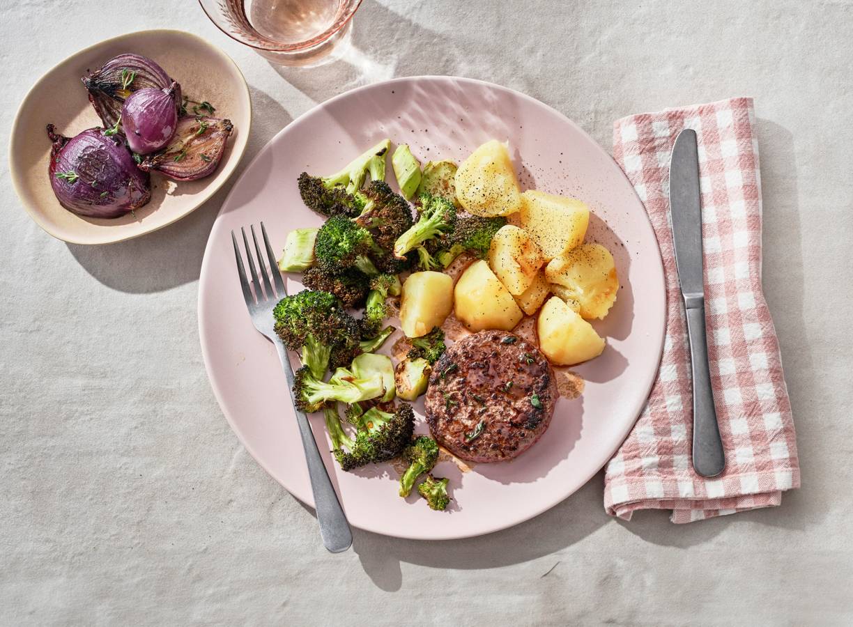 'Gewoon' een gezond AVG'tje? Gaan aan de slag met deze tartaartjes die je zelf op smaak brengt met tijm. Groente: broccoli en uien uit de oven. Zo simpel kan een gezond maaltje zijn.