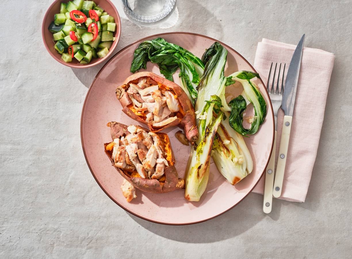 Probeer maar eens: zoete aardappel uit de oven, gevuld met kip met gebakken paksoi erbij. Voor wat extra groen doen we er een komkommersalade bij.