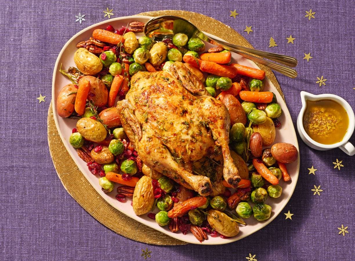 Haal de kip uit de oven, verpak in aluminiumfolie en laat 15 min. rusten. Vang het vocht op uit de braadslee en mix met de mosterd. Wel de cranberry’s 10 min. in warm water. Verhit ondertussen een pan zonder olie of boter op middelhoog vuur en bak de pecannoten bruin. Giet de cranberry’s af. Meng de pecannoten met de cranberries door de groenten en leg op een grote serveerschaal. Leg de gebraden kip ertussen en serveer met de mosterdsaus.