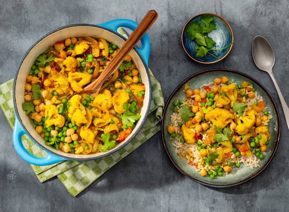Een geurige bloemkoolcurry met ui, knoflook, gember en curry madras, vol met kikkererwten en tuinerwten. Serveer met zilvervliesrijst en frisse koriander voor een kleurrijk, vega hoofdgerecht dat zo op tafel staat.