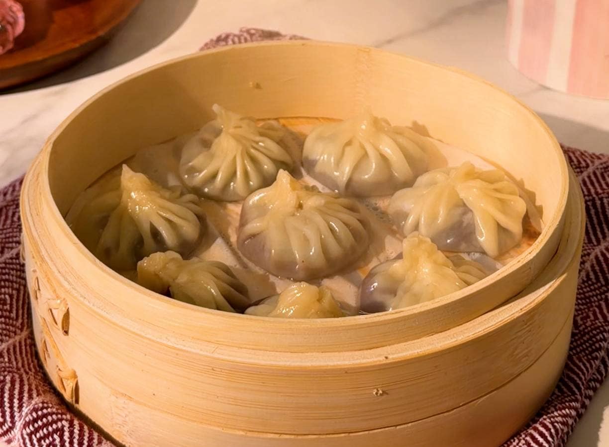 Verdeel de dumplings over het stoommandje en stoom met de deksel op de pan 5 min. Bestrijk eventueel na 4 min. met meer water als ze te droog worden.