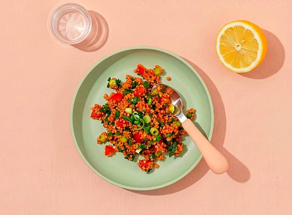 Koken met Kindergarden: Een frisse en kleurrijke kısır met volkoren bulgur. Licht, voedzaam en ideaal voor kinderen van Kindergarden, maar net zo makkelijk om thuis te maken!