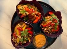 Rodekoolwraps met kip en pindasaus