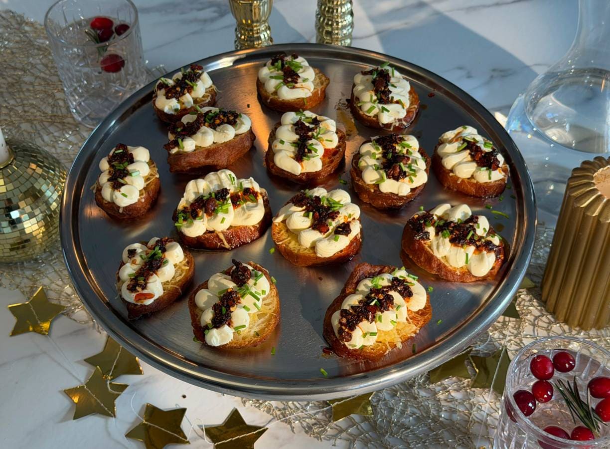 Geef je oliebollen een hartige upgrade! Serveer ze als heerlijke toastjes met roomkaas en crispy chili olie. Een verrassend lekker borrelhapje voor oud & nieuw.