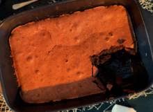 6. Vul de braadslee tot halverwege de rand van de ovenschaal met heet water. Gaar de browniepudding ca. 60 min. in de oven.