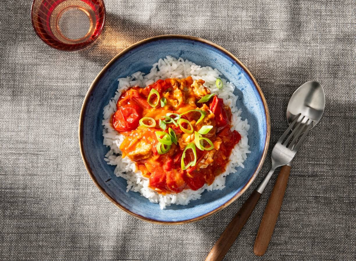 Een supersmakelijke stoof in 30 minuten? Met een pittige tomatensaus als basis en romige stukjes roerei erdoor, ben je dus echt zó klaar. Lekker met rijst of brood om mee te dippen.