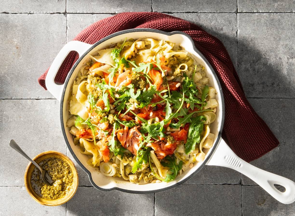 Breek de zalm in stukjes en verdeel samen met de rucola en de rest van de pesto erover. Bestrooi met de pijnboompitten.