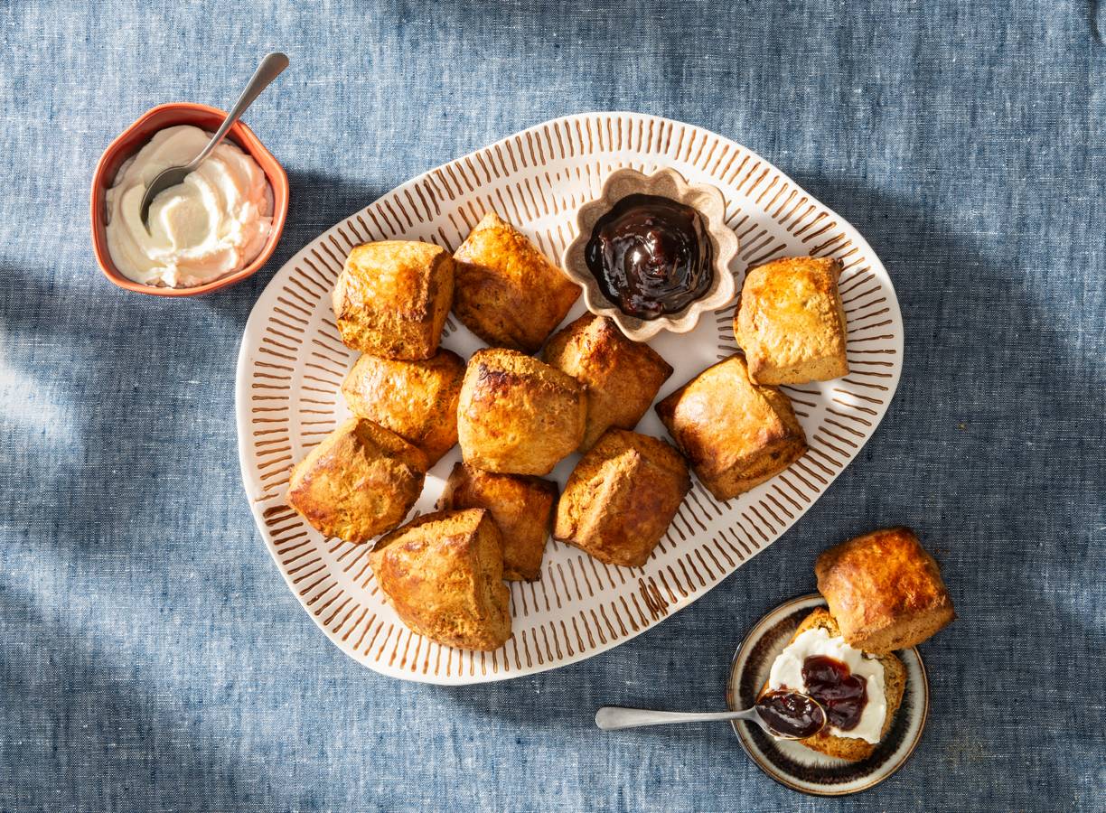 Snijd het deeg in 12 vierkante scones (per 12 stuks) en leg op een met bakpapier beklede bakplaat. Bestrijk met de bakkwast met wat karnemelk en bak in de oven in ca. 12-15 min. goudbruin en gaar. Laat de scones 10 min. afkoelen op een rooster.