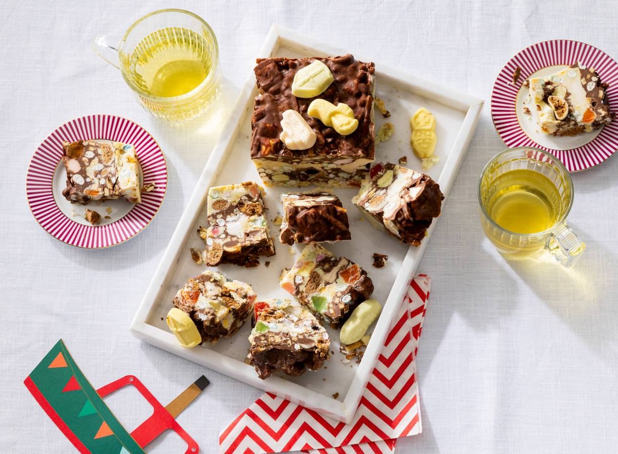 Haal de rocky road uit de koelkast, haal uit de vorm en verwijder het bakpapier. Snijd de rocky road met een scherp mes in stukken en verdeel over een plank.