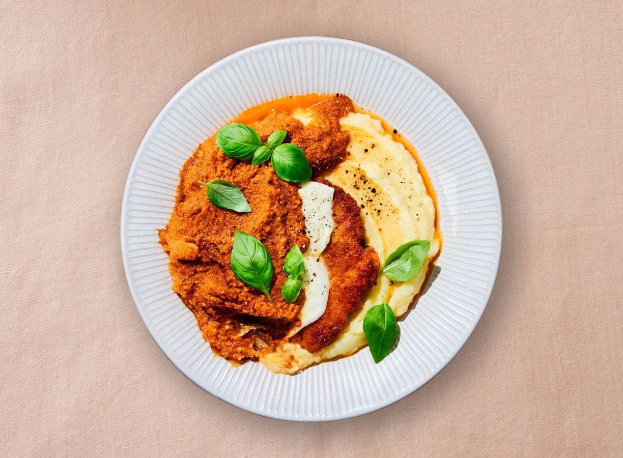 Schnitzel met aardappelpuree en tomaten-oreganosaus? Ja hoor! Dit romige comfort food met gesmolten mozzarella maak je eenvoudig op een doordeweekse avond.