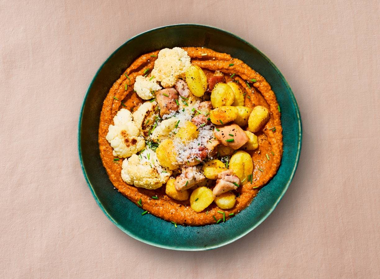 Schep de saus in 2 diepe borden en verdeel de gnochhi, kip en geroosterde bloemkool erover.