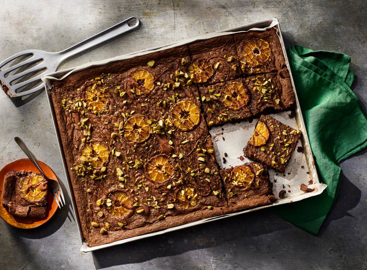 Smelt ondertussen de melkchocolade au bain-marie en hak de pistachenoten fijn. Haal de brownie uit de oven en besprenkel met de melkchocolade. Bestrooi met de pistache en het mandarijnrasp. Serveer warm of laat even afkoelen.