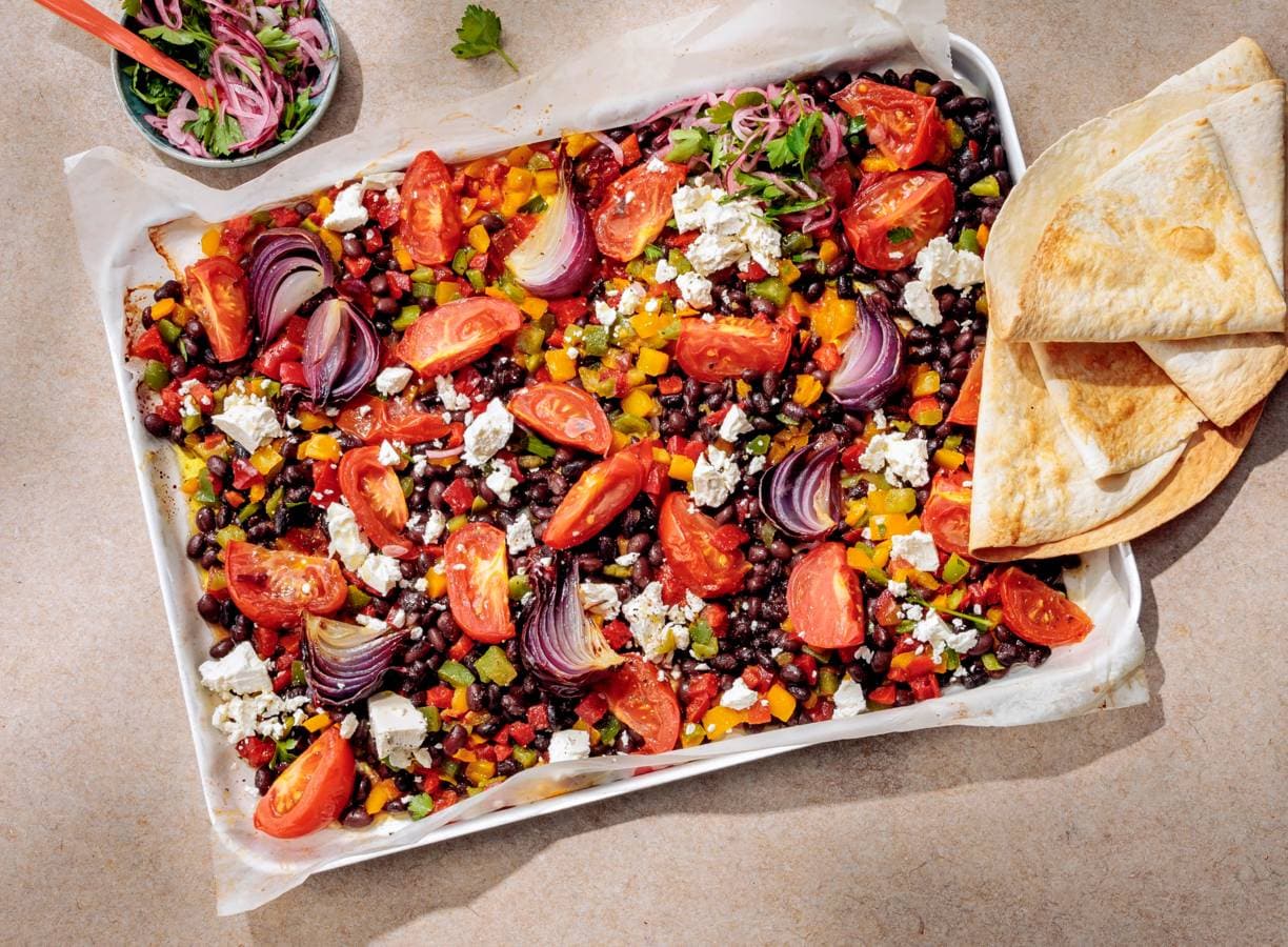 Met deze vega traybake ga je aan de slag voor de vulling van je wraps. Lekker veel bonen, tomaat, paprika en kruiden. Extra fijn: de oven doet het werk en jij hebt minimale afwas.