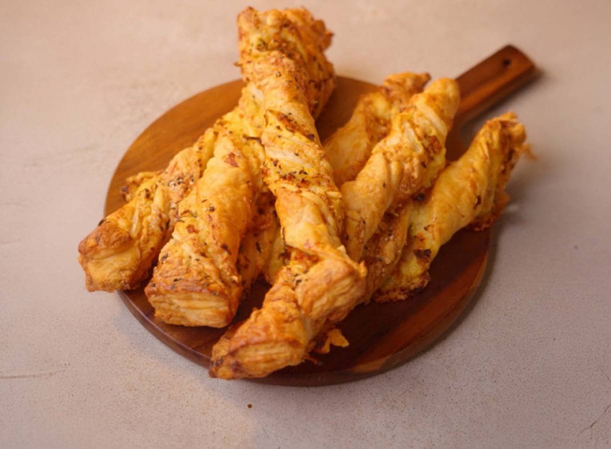 Verdeel de kimchi, bosui en ⅔ van de geraspte kaas erover. Bestrooi met peper en eventueel zout. Dek af met de tweede rol bladerdeeg. Meng het losgeklopte ei met 2 el (per 6 stengels) kimchivocht. Besmeer de bovenkant van het bladerdeeg met een bakkwast met het eimengsel. Bestrooi met de rest van de kaas en de sesamzaadjes, druk deze lichtjes in het deeg. Snijd in de lengte in 6 gelijke repen.