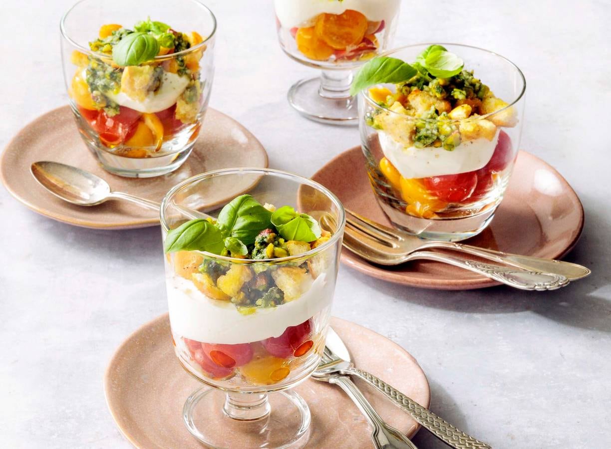 5. Verdeel de gemarineerde tomaten over de glazen. Halveer de burrata’s en verdeel samen met de pesto en croutons erover. Bestrooi met de rest van de basilicum.