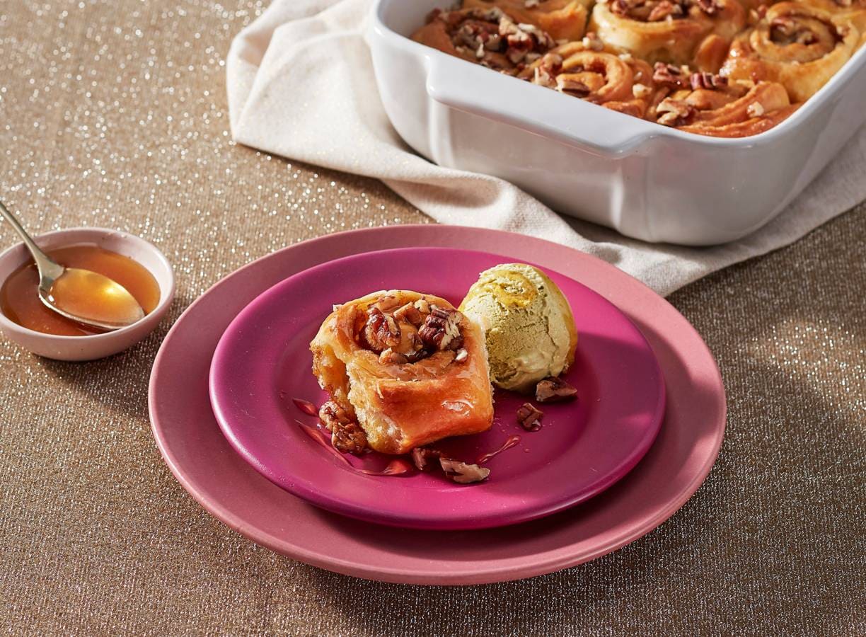 Meng ondertussen de rest van de honing en kardemom. Haal de broodjes uit de oven, schenk direct het honingmengsel erover en bestrooi met de rest van de pecannoten. Laat 5-10 min. in de bakvorm afkoelen.