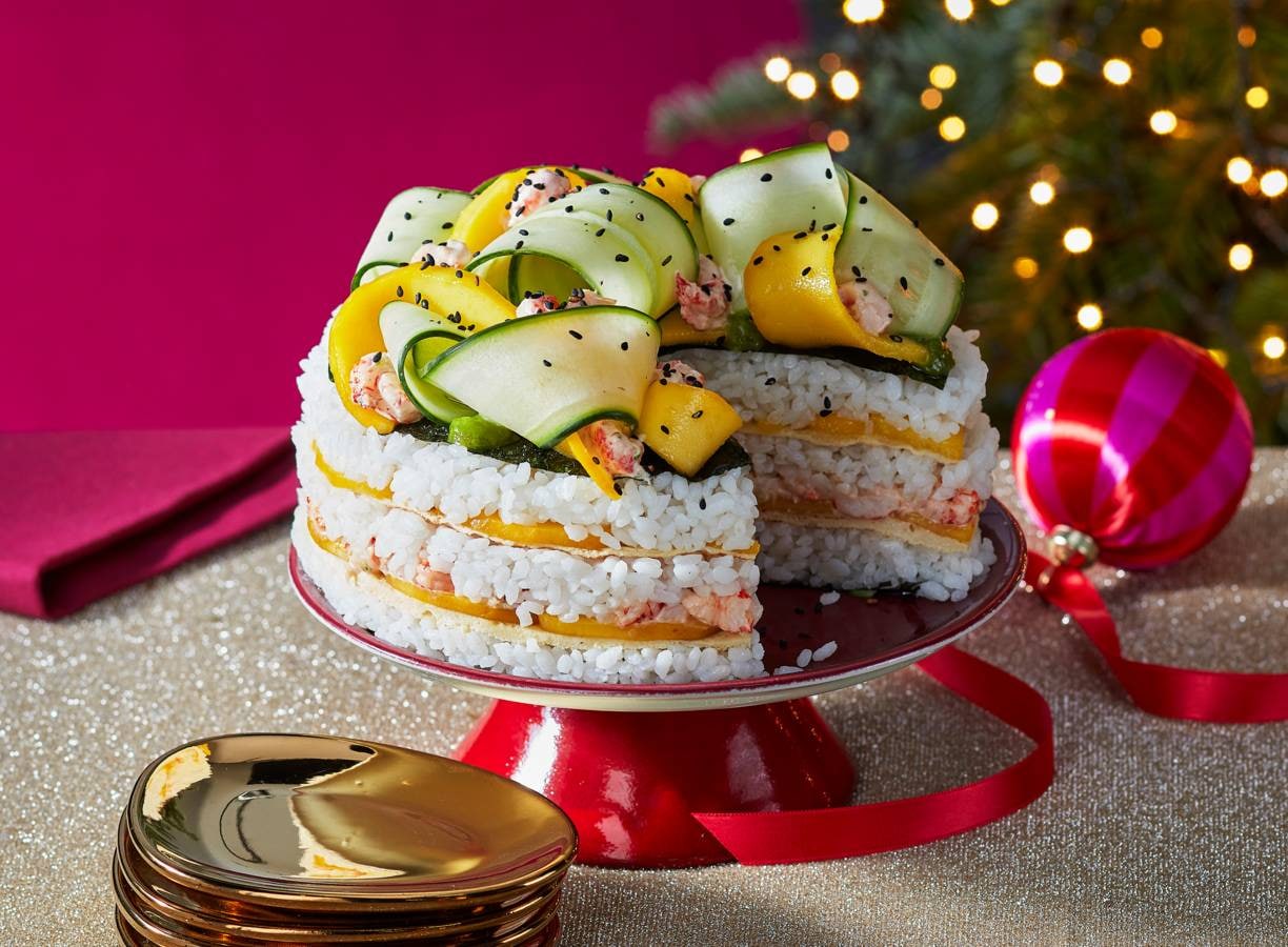 In deze taart maken de laagjes van omelet, nori, sushirijst, frisromige rivierkreeftjes en mango er een heerlijk sushi-kerstfeest van. Leuk om samen te delen als voorgerecht met kerst.