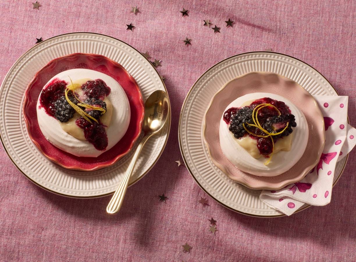 Deze vegan pavlova maak je met aquafaba - het vocht van kikkererwten - en top je af met een zoete bramencompote. Superfeestelijk als kersttoetje!