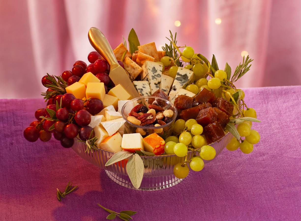 Snijd alle kazen in blokjes, punten en repen. Haal de chutney uit de koelkast, verwijder de folie en snijd de chutney in blokjes van 2 cm. Verdeel de helft van de chutneyblokjes, de rozemarijn en salie over de serveerschaal. Leg hier de druiven op en laat ze over de rand hangen. Verdeel alle stukjes kaas ertussen en verdeel de scrocchi, de rest van de chutneyblokjes en cranberry-notenmix erbij en serveer.