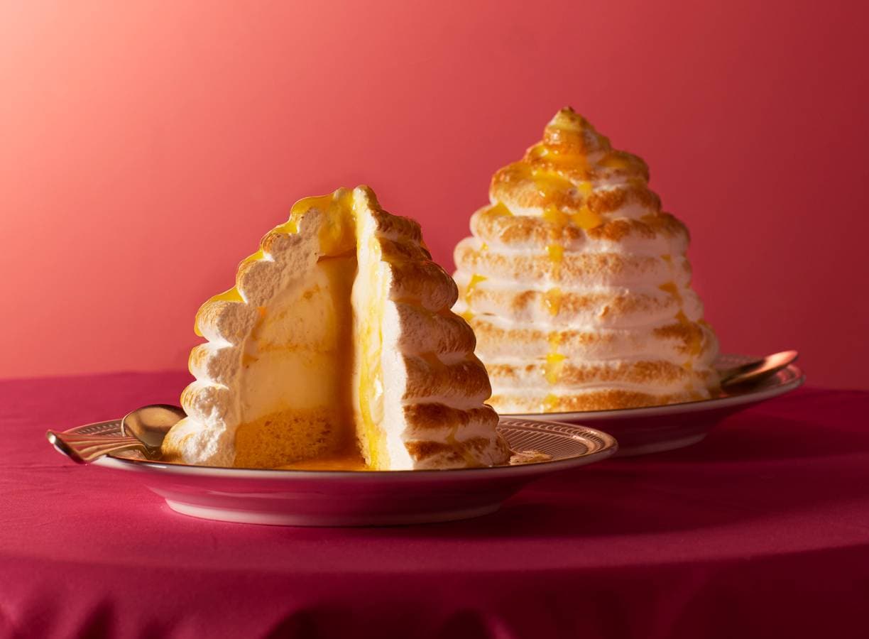 Dit dessert heeft het allemaal: meringue, yoghurtijs en een swirl van mango. Drizzle aan tafel wat frisse mangocoulis over je Baked Alaska en je kunt genieten!