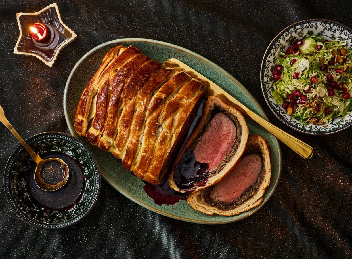 Verras je gasten met Beef Wellington: sappig rundvlees omhuld in krokant croissantdeeg voor een vleugje zoet, geserveerd met glühweinjus voor een warmte, luxe en feestelijke smaak.