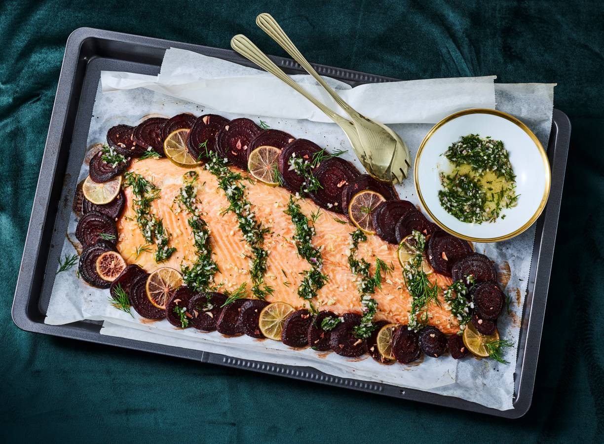 Leg de zalmzijde in het midden van een met bakpapier beklede bakplaat en verdeel de bieten dakpansgewijs in een ovale vorm rondom de zalm. Steek de plakken limoen ertussen. Bak 10-15 min. tot de zalm rosé is.