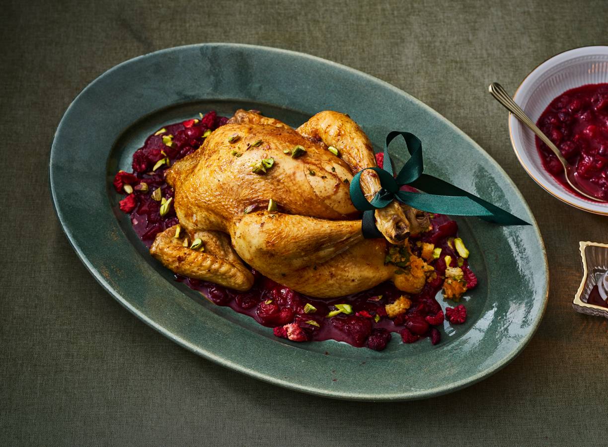 Gevulde kip met een fris-groene pistachevulling met knoflook en peterselie, en daaroverheen een cranberrysaus die zoet, zuur en kruidig samenbrengt. De frambozencoulis geeft precies die sprankel die kerst net wat moderner maakt.