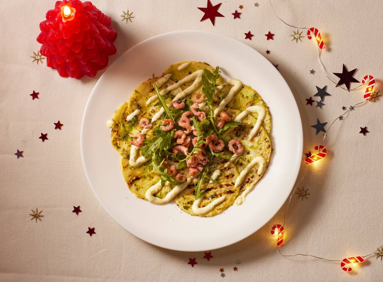 Dunne plakjes knolselderij met frisse limoen, verse kruiden en romige mayonaise, afgetopt met Hollandse garnalen en rucola. Een licht, feestelijk voorgerecht van Hugo Kennis.