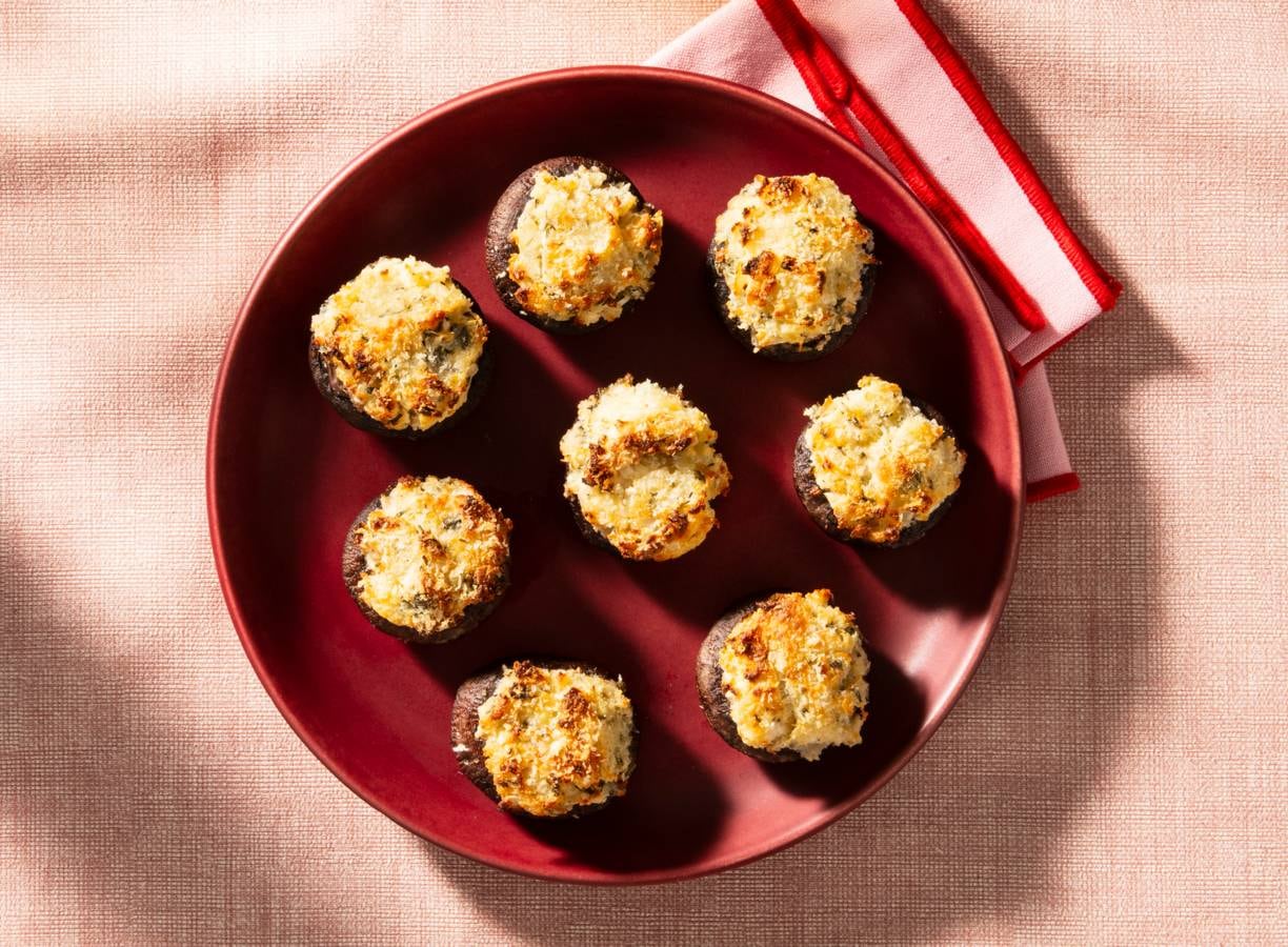Dit gevulde paddenstoeltje tikt alles af: aards, romig en een crunch van kaas. Het perfecte hapje om de avond mee te starten.