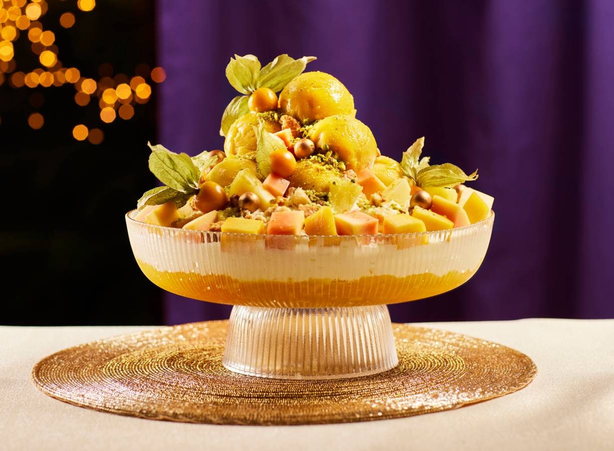 Zonnige mangopuree, romige kokos en frisse citrusaccenten vormen samen een licht, plantaardig kerstdessert dat tegelijk feestelijk én verrassend simpel is.