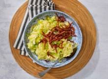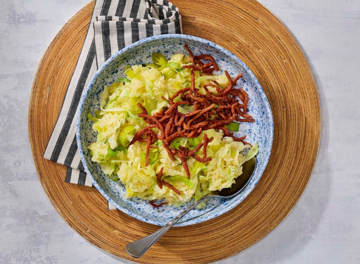 Spitskoolstamppot met vegaspekjes en kaas