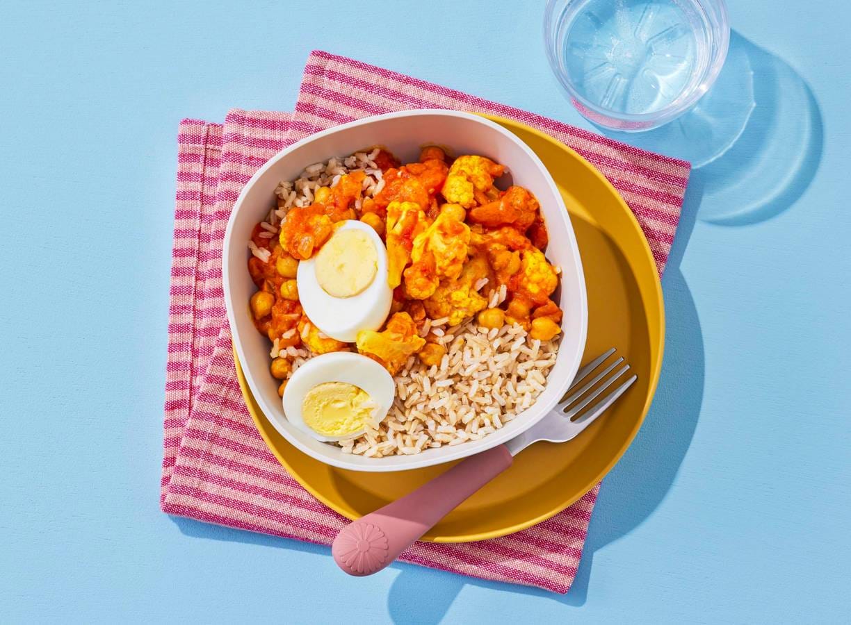 Koken met Kindergarden: een heerlijke bloemkoolcurry met kikkererwten en ei die in de smaak valt bij de kinderen van Kindergarden, maar ook makkelijk te bereiden is thuis!
