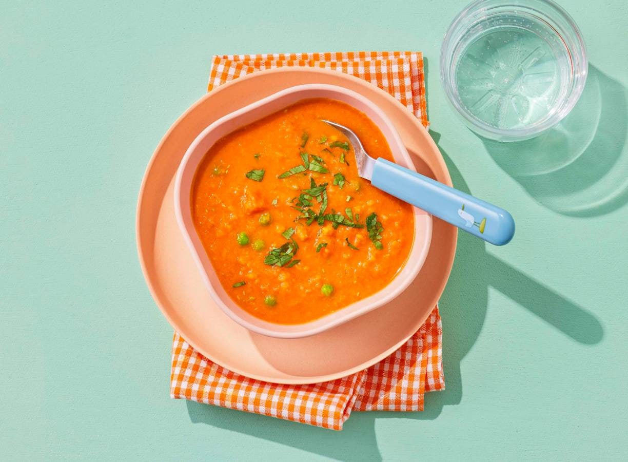 Koken met Kindergarden: Een zachte en voedzame lente-linzensoep met wortel en frisse tuinerwten. Een warm en kleurrijk gerecht dat thuis net zo makkelijk te maken is!