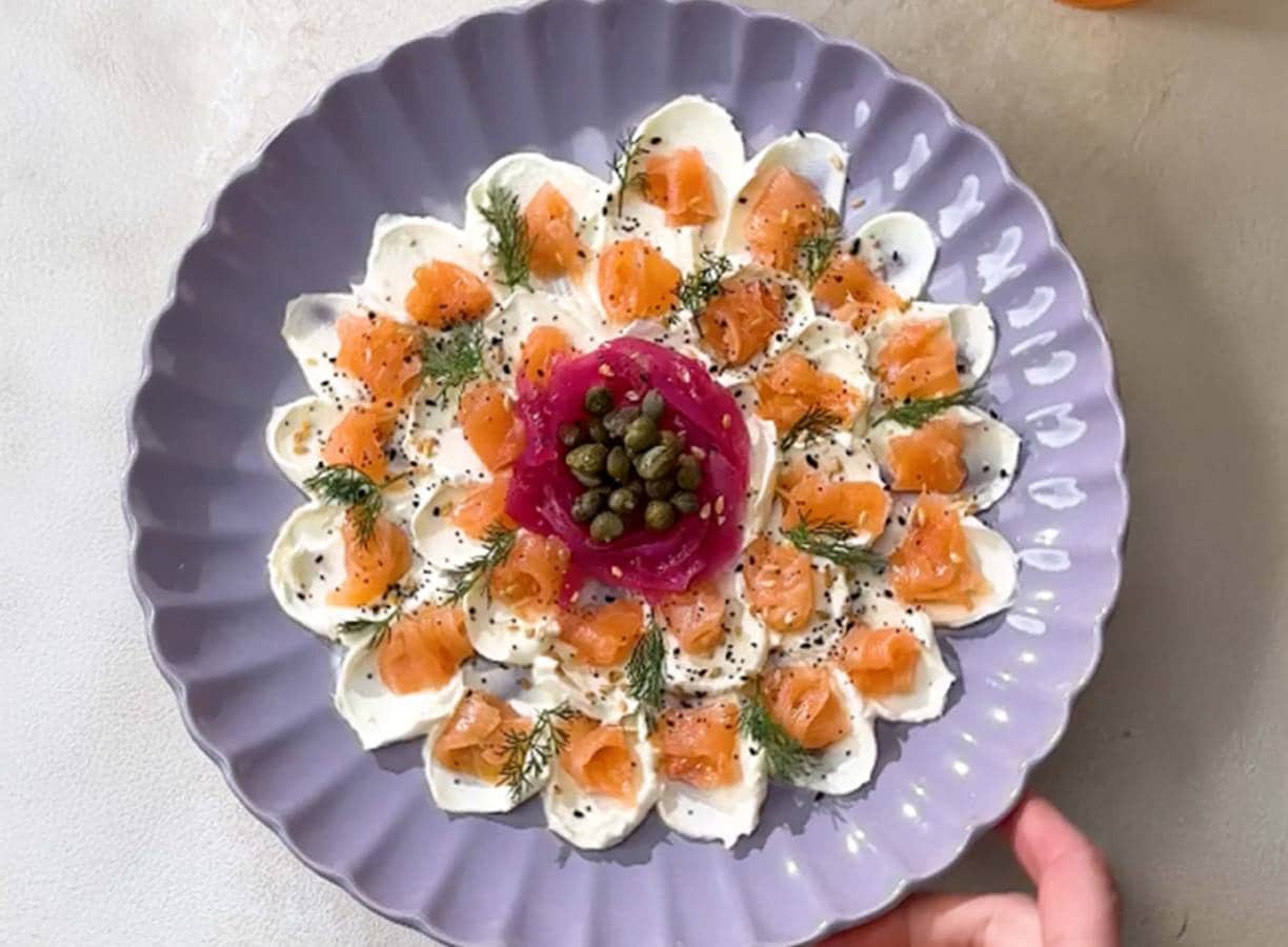 Zet letterlijk de bloemetjes op tafel met dit bagel flower board van roomkaas, zalm en evertything bagel kruiden. Binnen een kwartier klaar en gegarandeerd succes bij elke brunch of borrel.