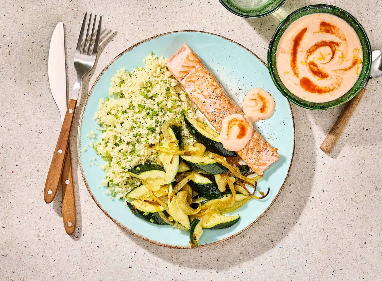 Gebakken zalm met couscous, courgette en harissa