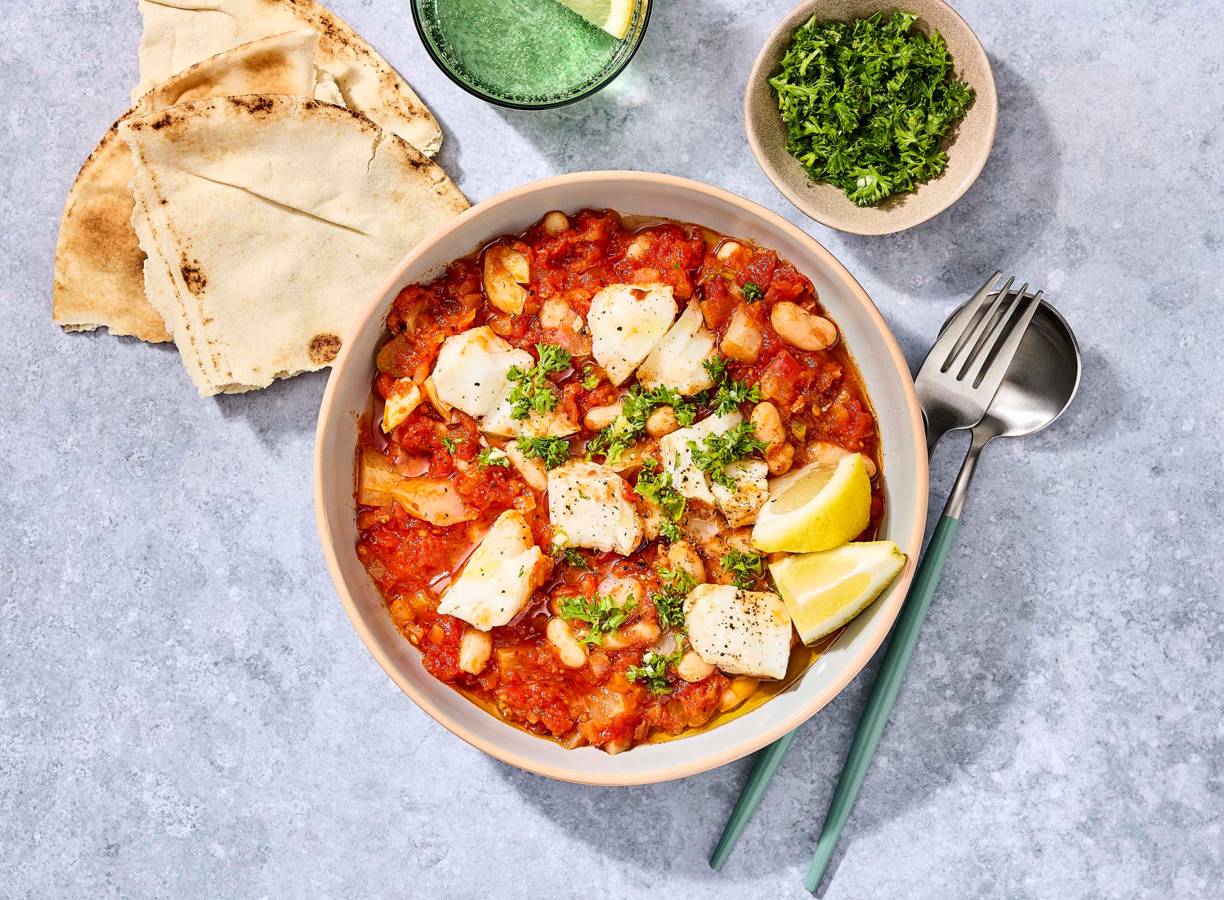 Deze kabeljauw gaart zacht in een vurige ’nduja-tomatensaus met venkel en romige cannellinibonen, met frisse citroen en peterselie. Bestek is overbodig: scheur het Libanese brood in stukken en schep daarmee al die heerlijke Mediterrane smaken op.