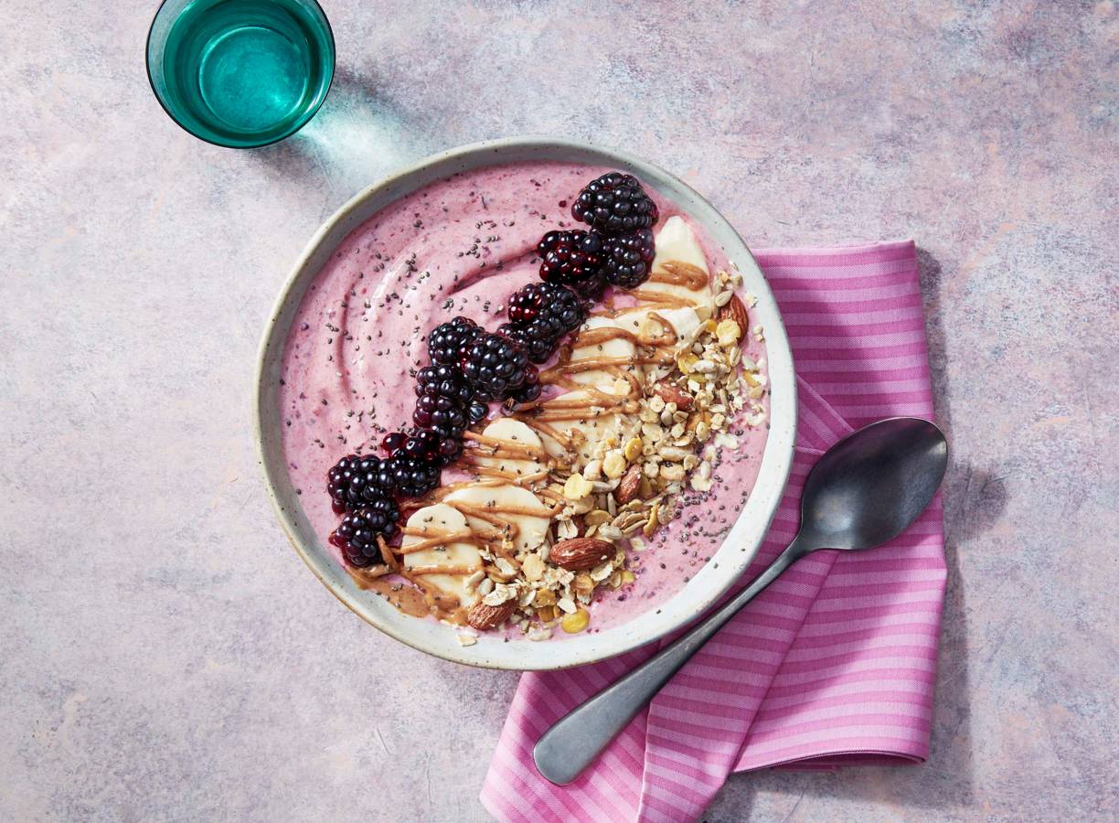 Verdeel de smoothie over diepe kommen. Snijd de rest van de banaan in plakjes en halveer de rest van de bramen. Verdeel de banaan en bramen samen met de granola en de rest van de chiazaad erover en besprenkel met de pindakaas.