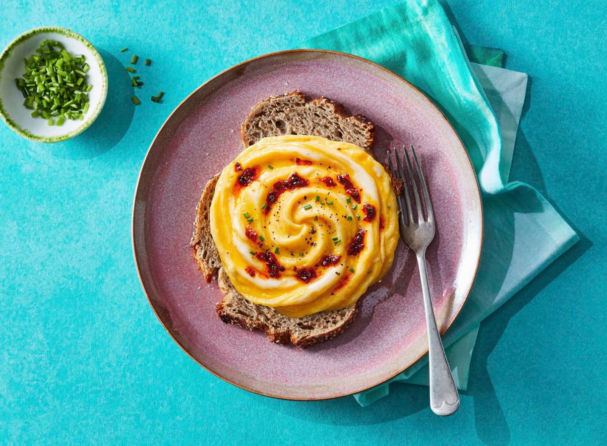 - combinatietipDit recept wordt nog lekkerder door het ei te serveren op een cracker of broodje met crispy chili oil en fijngesneden bieslook erover.