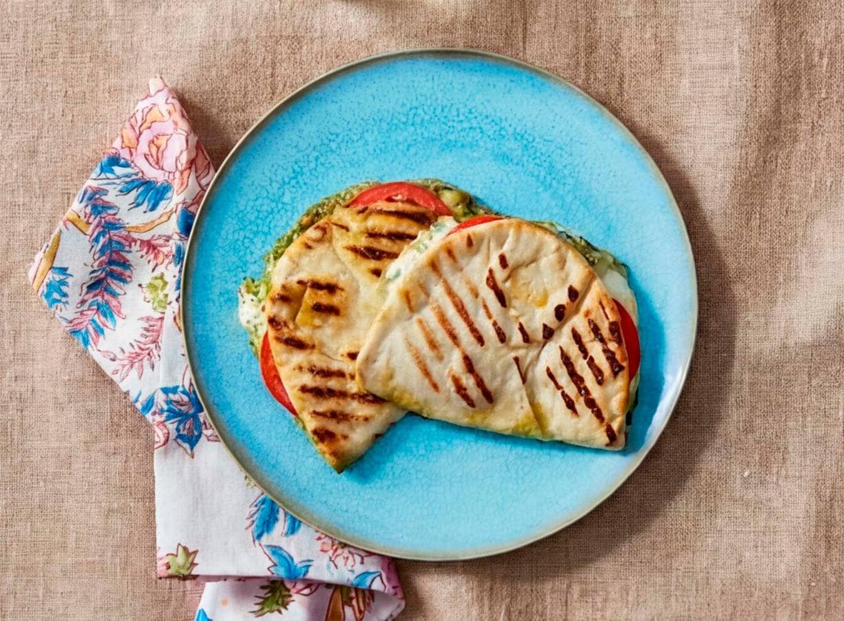 Upgrade de standaard tosti en kies voor dit flatbread met een Italiaanse twist. De laagjes gesmolten mozzarella, groene pesto en tomaat vormen de ideale smaakcombi voor een lunch die al in 15 min. op tafel staat.